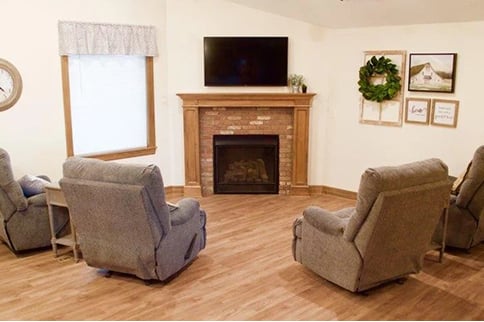 The interior features an open floor plan, a large corner fireplace, and a generous main-level visiting area perfect for family gatherings. But the highlight of this home is the spacious backyard, a serene setting where residents and loved ones can enjoy fresh air, sunshine, and connection. Rose Hill House combines warmth, privacy, and thoughtful design in a truly home-like setting.